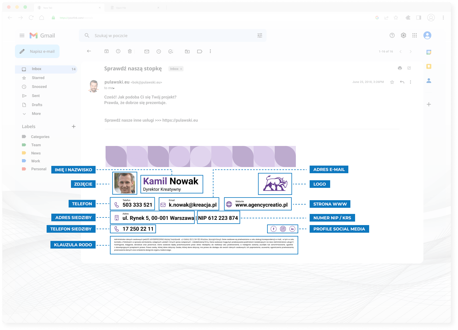 Kompleksowy zestaw elementów, które składają się na wizerunkową, funkcjonalną i technicznie kompatybilną stopkę e-mail, gotową do wdrożenia w Twojej firmie.