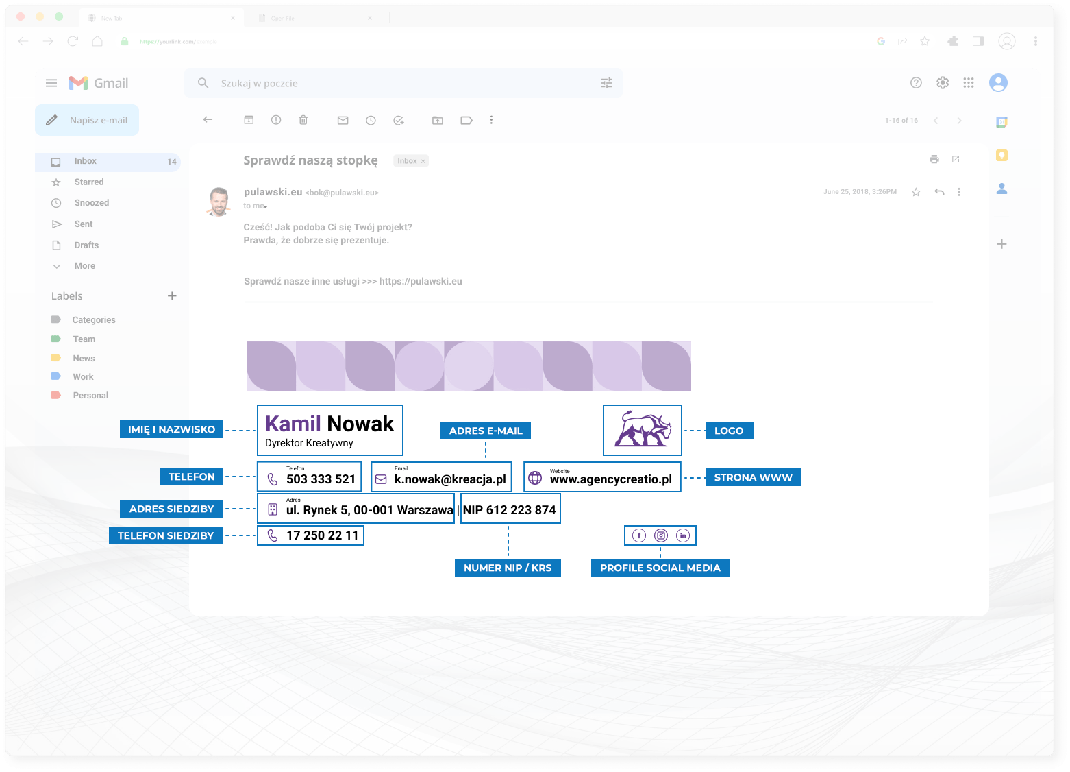 - ✔︎ Personalizacje – możliwość przygotowania do 10 wersji stopki dla członków zespołu z unikalnymi danymi: imię, stanowisko, telefon, e-mail